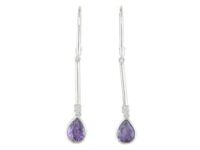 Long 14kt White Gold Amethyst and Diamond Dangle Earrings with two pear amethysts (1.24ctw) and two round diamonds (0.06ctw). Elegant and vibrant.