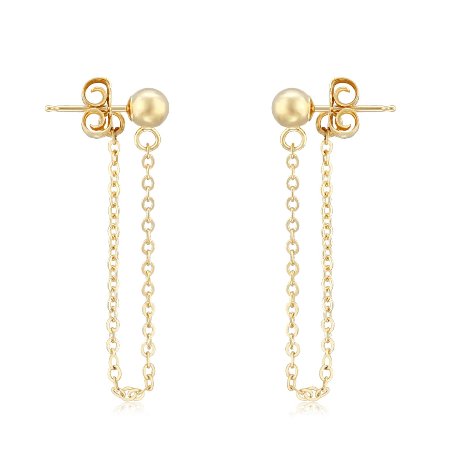 Ball Stud Earring with Chain: Stylish 14k yellow gold 4mm ball earrings with a 1.5″ chain. A modern, dynamic design that adds movement and shine to your look.