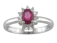 Diamond Halo Ruby Ring:  Vibrant 14K white gold fashion ring with a 0.60ct oval ruby encircled by 12 dazzling round diamonds (0.15Tw). A true statement piece.