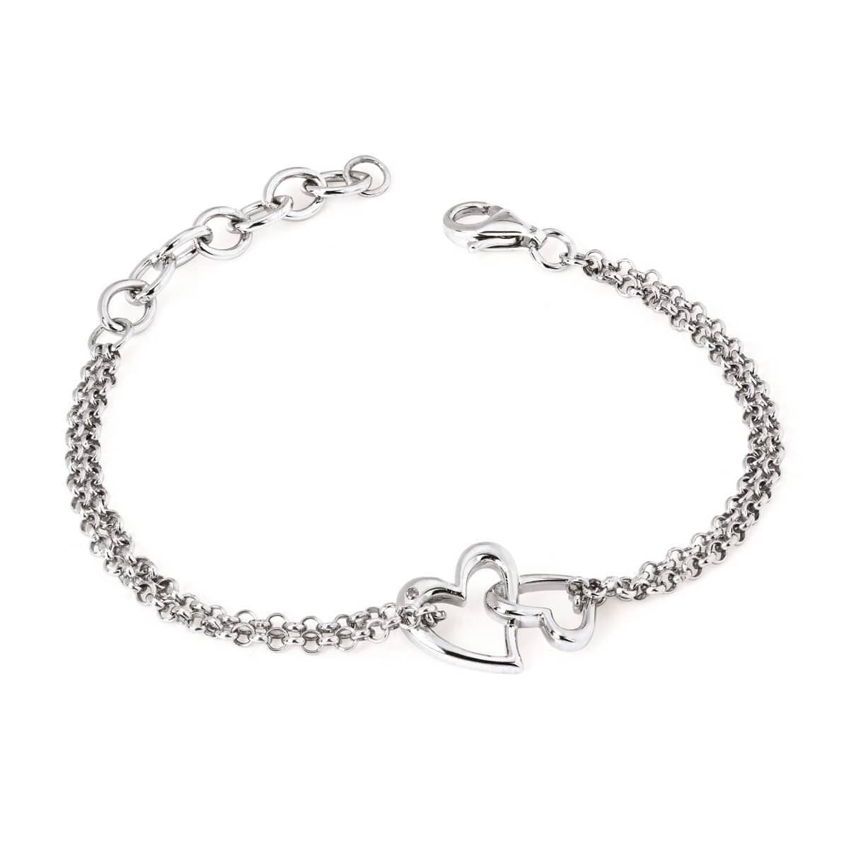 Sterling Silver Double Heart Bracelet with Double Chain and One 0.01Ct Round Diamond. A classic and timeless piece great for layering or wearing by itself.