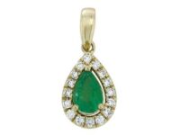 Indulge in the regal beauty of this stunning pendant. It showcases a magnificent carat pear-cut natural emerald, prized for its intense, velvety green color. The emerald is beautifully framed by 16 brilliant round diamonds, totaling carats total weight (), which add a dazzling, fiery contrast. Set in classic Karat Yellow Gold, this piece combines vintage romance with luxurious style. A perfect centerpiece for any fine jewelry collection.Indulge in the regal beauty of this stunning pendant. It showcases a magnificent carat pear-cut natural emerald, prized for its intense, velvety green color. The emerald is beautifully framed by 16 brilliant round diamonds, totaling carats total weight (), which add a dazzling, fiery contrast. Set in classic Karat Yellow Gold, this piece combines vintage romance with luxurious style. A perfect centerpiece for any fine jewelry collection.
