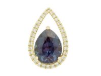 Pear Shaped Created Alexandrite and Diamond Pendant: A magnificent pear-cut Created Alexandrite (changes color!) accented by of diamonds in Yellow Gold.