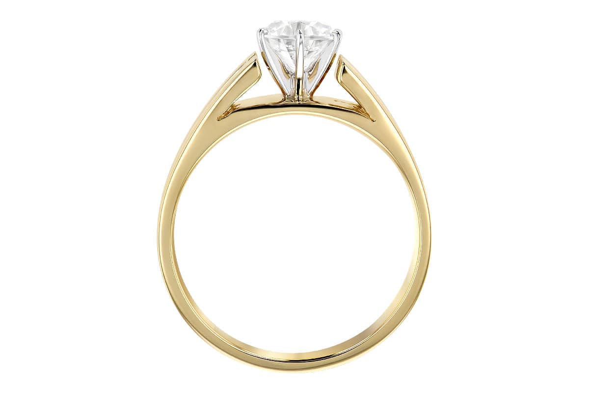 Elegant semi-mount engagement ring featuring a 14kt yellow gold band with a channel of round brilliant diamonds leading to a six-prong setting.