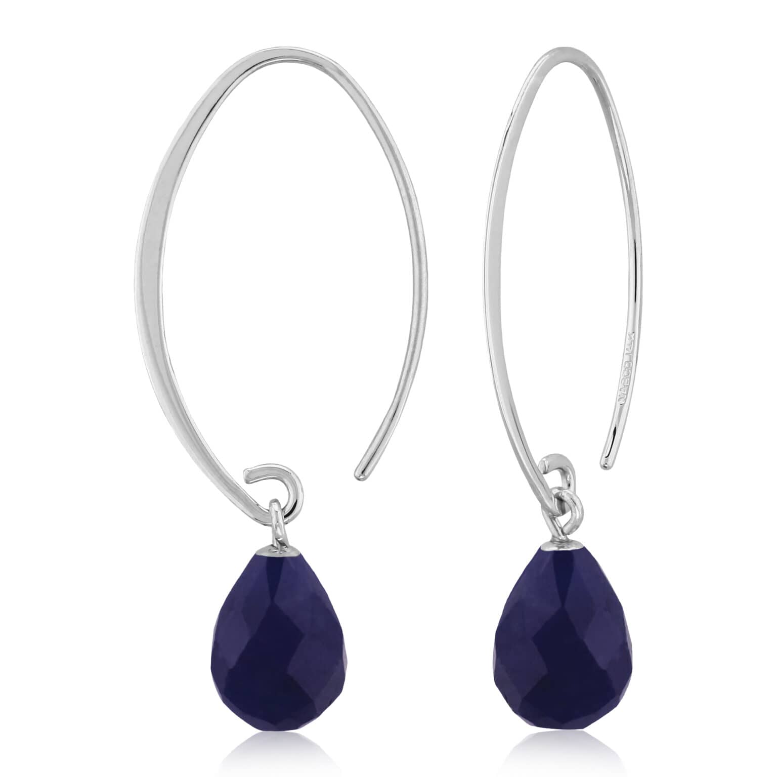 Sapphire Briolette Earrings: Sleek sterling silver swoop earrings with dangling briolette-cut sapphires. Modern, elegant, and perfect for September birthdays.