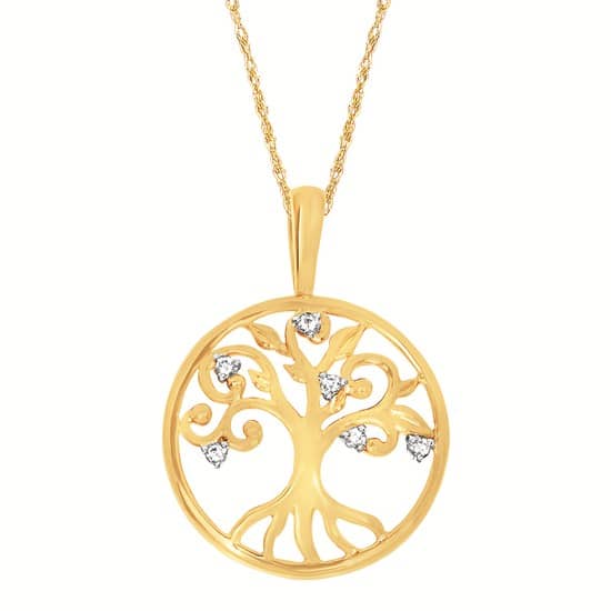 This gold Tree of Life necklace features sparkling diamond accents in a circular pendant, blending elegant design with meaningful symbolism.