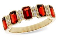 Yellow Gold Diamond and Garnet Fashion Ring: This wide band features five large Emerald-Cut Garnets () and 12 accent Round Diamonds (), all set in rich Karat Yellow Gold.