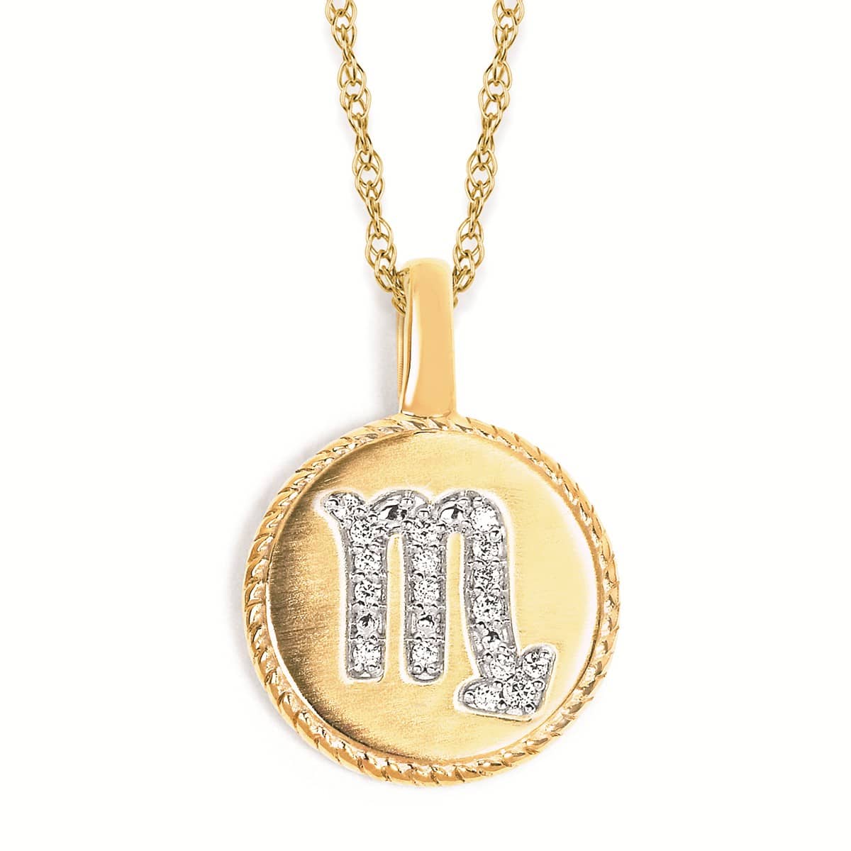 A mesmerizing and intense tribute to the Scorpio in your life. This 14 karat yellow gold disc pendant features a beautifully rendered Scorpio zodiac symbol, elegantly outlined with 0.05 total carat weight of pavé-set, round brilliant diamonds. The delicate yet durable pendant hangs from a matching 18-inch 14kt yellow gold light rope chain, creating a timeless and meaningful piece. Perfect for layering or wearing on its own, this necklace is a beautiful way to celebrate passion, resilience, and the water sign you love.